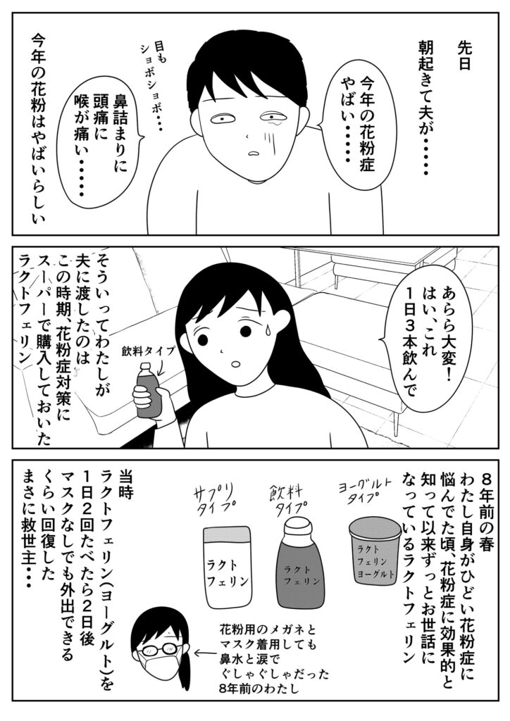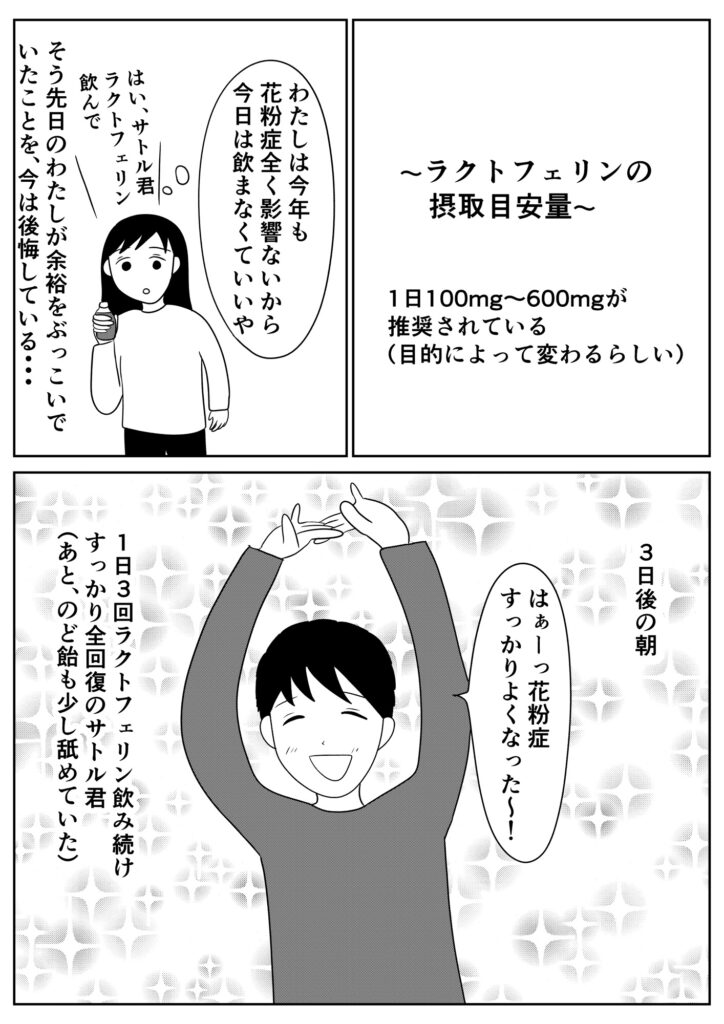 改めて調べるとラクトフェリンは、花粉症に効果的なこと以外にも腸内環境の改善や、免疫力向上など様々な素晴らしい効果があるみたいで、普段からもっと積極的に飲もうかと思いました。