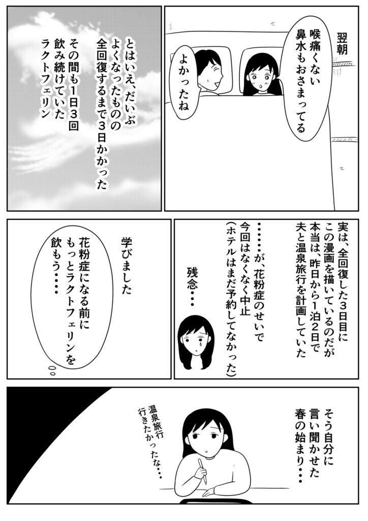 直前まで、旅行に行こうか悩んだが花粉症が治りかけで悪化するのが不安だったのと、とても本調子ではなかったので、夫婦で話し合って旅行は見送ることにしました。